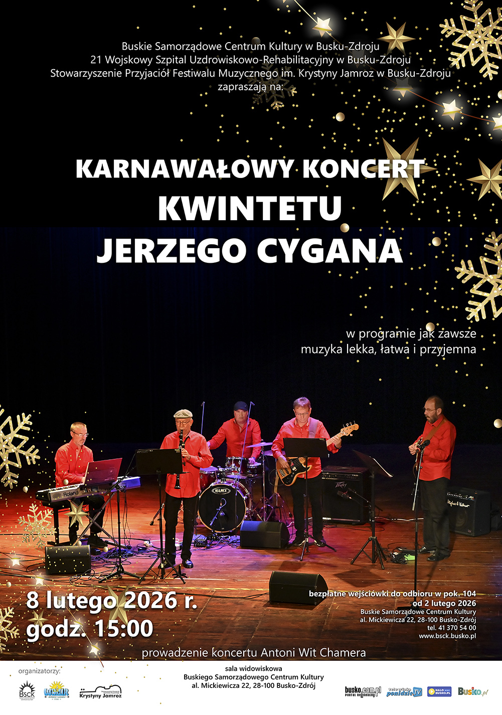 W niedzielę, 8 lutego zapraszamy na karnawałowy koncert Kwintetu Jerzego Cygana. Koncert odbędzie się o godz. 15:00 w sali widowiskowej BSCK przy al. Mickiewicza 22. Wydarzenie poprowadzi Antoni Wit Chamera.