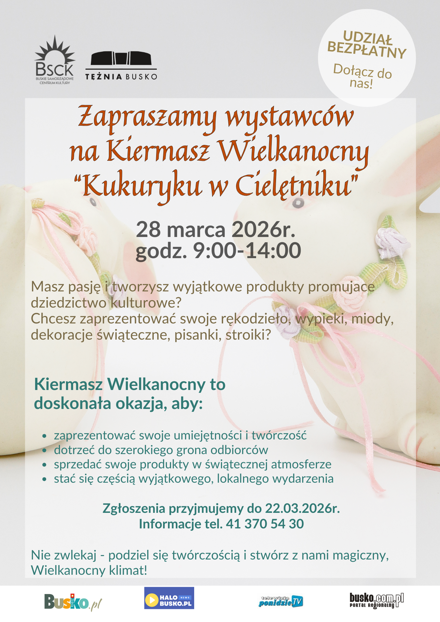 Mieszkańców i gości Buska-Zdroju serdecznie zapraszamy na Kiermasz Wielkanocny „Kukuryku w Cielętniku” , który odbędzie się w sobotę, 28.03.2026 roku, od godziny 9:00 na Placu Zwycięstwa w Busku – Zdroju.