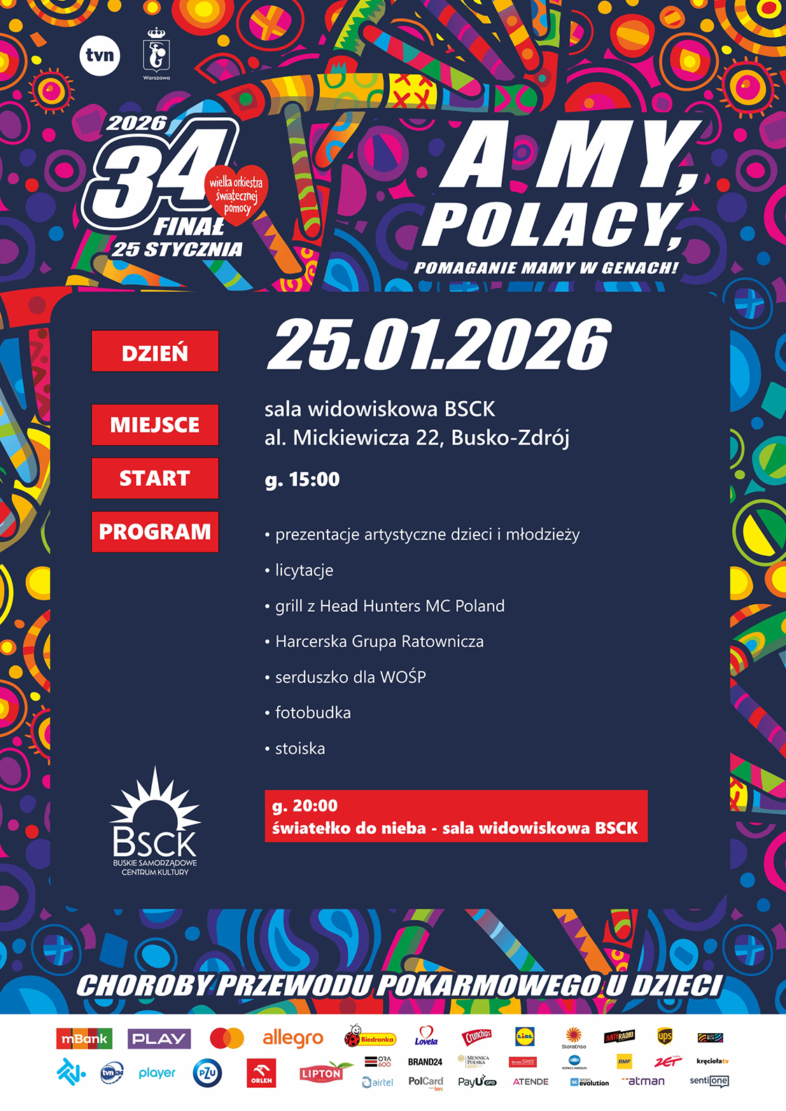 Zapraszamy wszystkich 25 stycznia do udziału w 34. Finale Wielkiej Orkiestry Świątecznej Pomocy. Startujemy w Buskim Samorządowym Centrum Kultury o g. 15:00. Czekają na Was występy artystyczne, licytacje, stoiska i inne […]