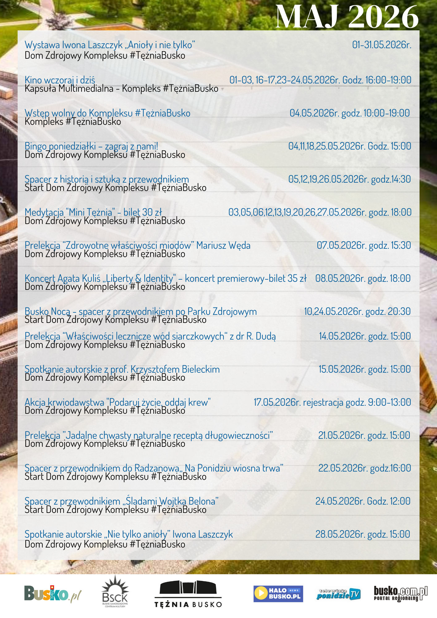 Zapraszamy do Kompleksu #TężniaBusko w maju. Poniżej lista wydarzeń: